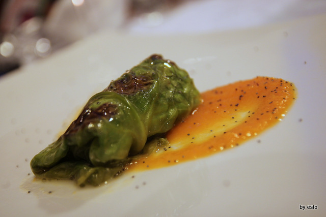 E via in tavola, dopo delle appetitose pizzelle profumate di mare per le alghe, l’ Involtino di verza pesce bandiera e fior di latte su zucca con semi di papavero.