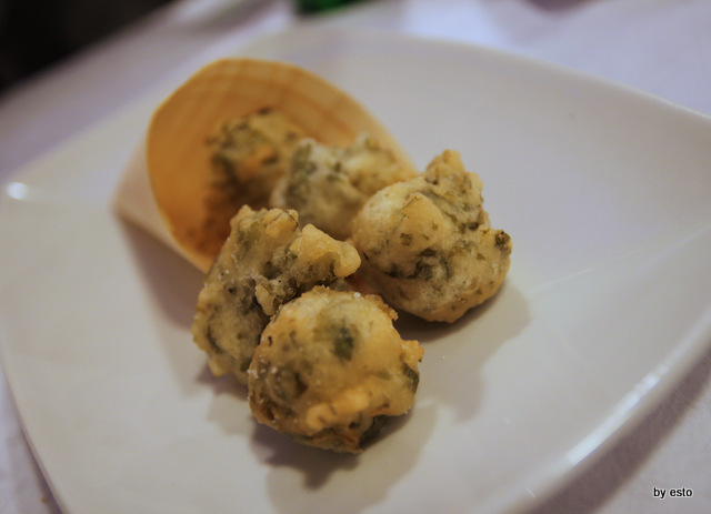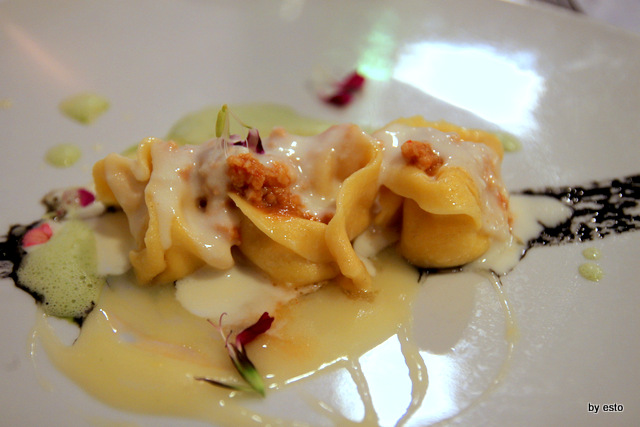 Il primo è il Tortello ripieno di fonduta di bufala su crema di patate caviale di gamberi e spuma di cicoria. Buona la sfoglia e la mozzarella, quasi un liquido cuore. Simpatico l’amaricante della cicoria in contrasto con la patata.