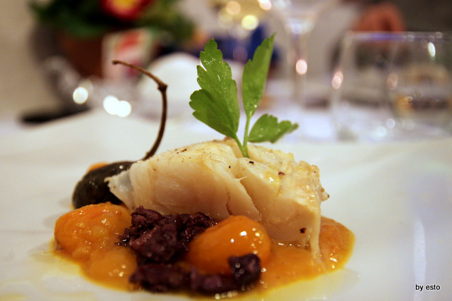 Il secondo è un trancio di coroniello di Stoccafisso di Somma Vesuviana alla napoletana rivisitato su datterino giallo, cappero in fiore e pane saporito. Una bella presentazione e una materia prima di grande qualità.