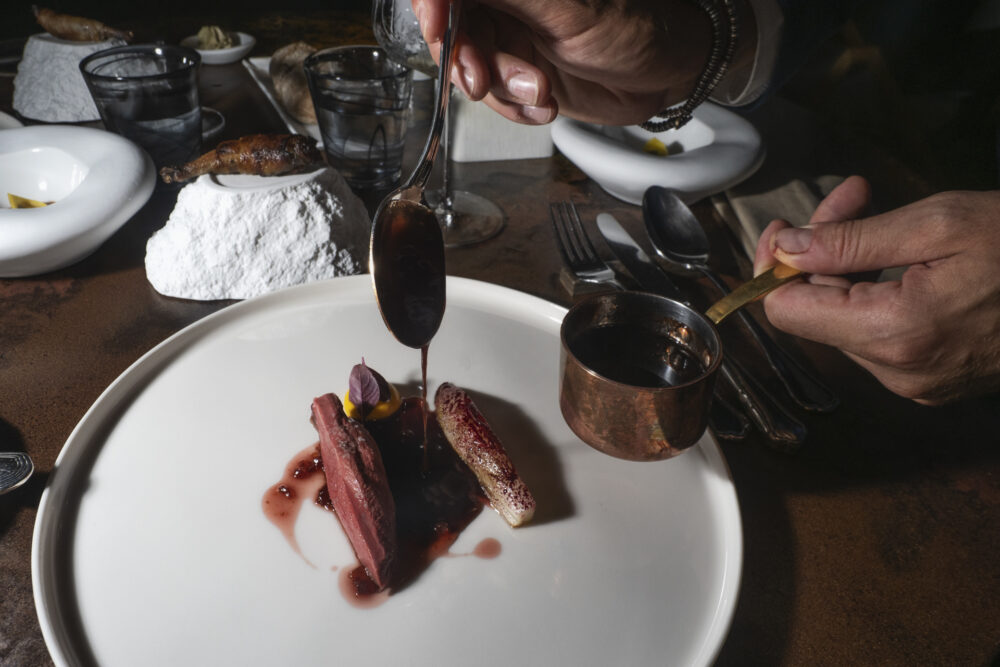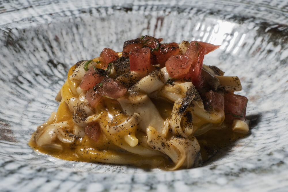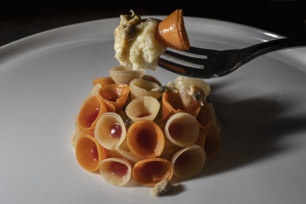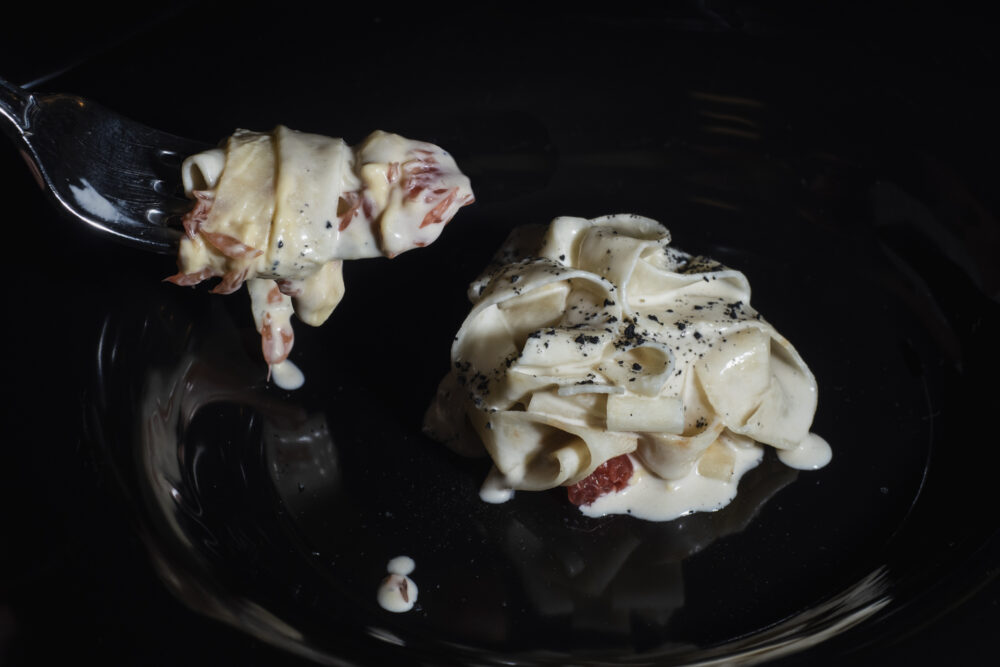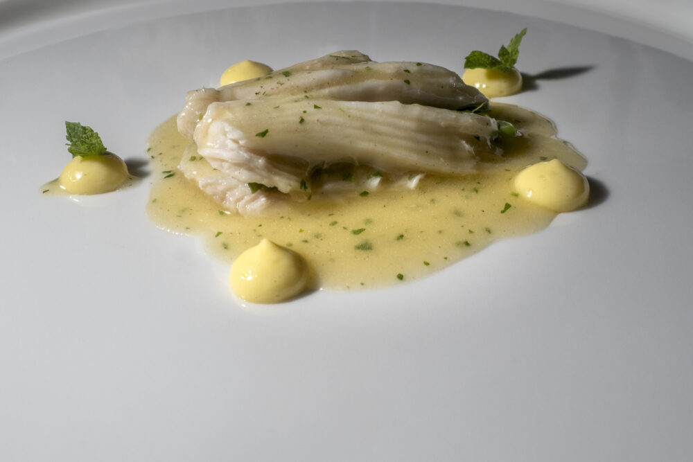 Negli antipasti a colpire è subito la Razza alla mugnaia, in salsa olandese e fagiolini. Deliziosa, caposaldo del Ferrarini pensiero: un piatto locale, con le consuete provocazioni acide e succulente, quasi carnose. Potente e delicato, avvolgente. Segue l’autentico capolavoro della Tagliatella 100% sedano rapa avvolta da bagnacauda e pompelmo rosa.