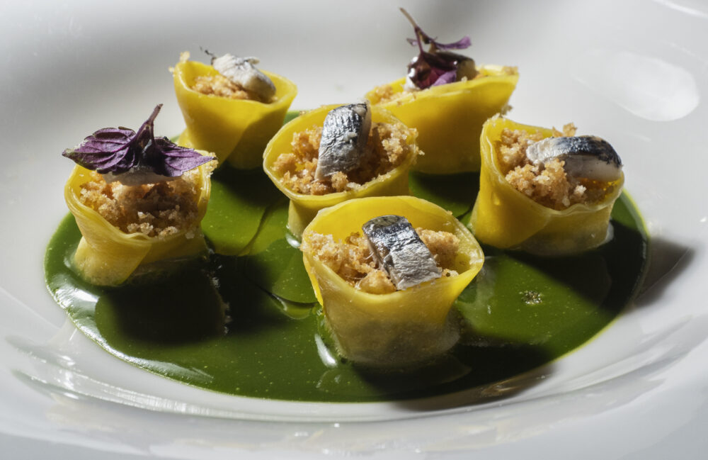 Delizioso ed infinito. Non c’è sosta nella verve del menu dello Sciabola con la Patata e ragù d’arselle, divertissement ancora una volta di altissimo livello fino ai primi, dalla più tradizionale Linguina ai cannolicchi e seppia in polvere (ancora una volta con quel grip da trattoria tanto liberatorio) fino al Raviolo in burro d’Acciuga pane e uvetta, che unisce delicatezza e potenza.