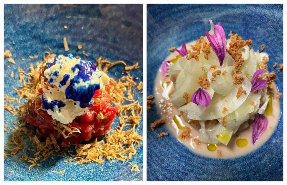 Tartare di vacca modicana, gelato al blu siciliano, tartufo estivoe – Tartare di ricciola con insalata di finocchi, latte di mandorla e bottarga