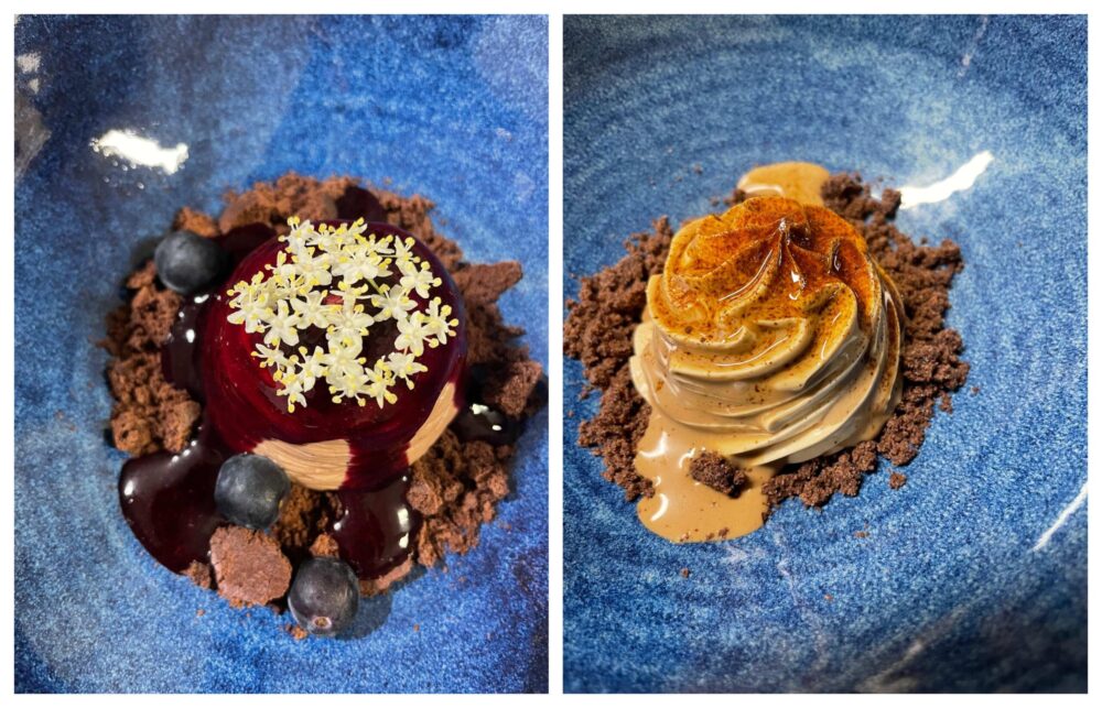 Moussé al cioccolato amaro, sambuco e mirtilli e Mousse alla liquirizia con caffé e crumble salato