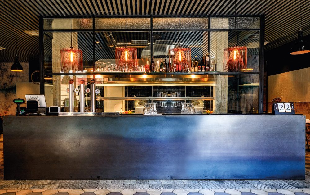 Il locale si sviluppa su 150mq, banco centrale in ferro grezzo marcato da quattro pendenti in corten Wever&Ducrè; il soffitto è fatto di montanti di alluminio da cui piccoli spot, ben nascosti, creano l’effetto “occhio di bue”. I tavoli sono in ferro nero e le sedie in cuoio marrone con pareti lasciate volutamente grezze ma trattate con resina trasparente che ricordano una Berlino dei tempi andati rendendo l’ambiante tipicamente urbano.