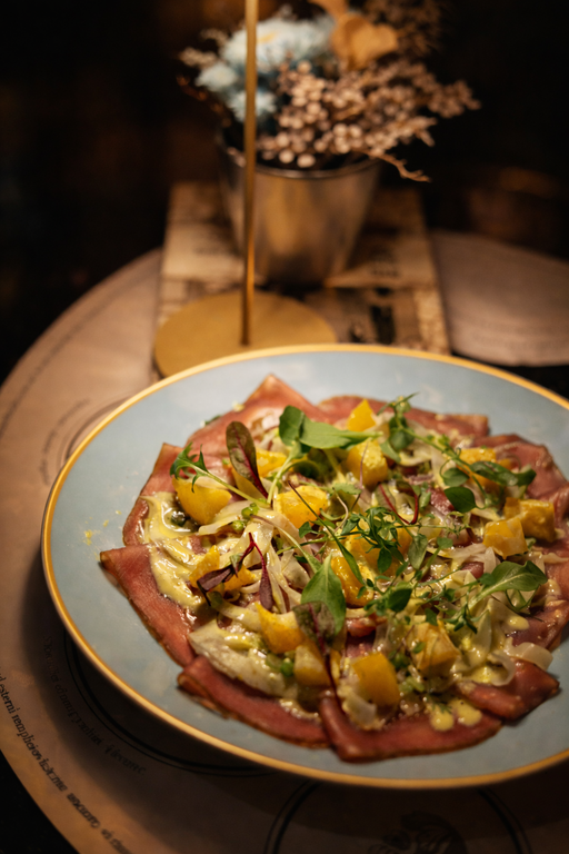 La carta del bistrot è costruita come un libro di racconti: ogni piatto è un capitolo, un rimando a figure leggendarie, luoghi simbolici, frammenti di identità cittadina.