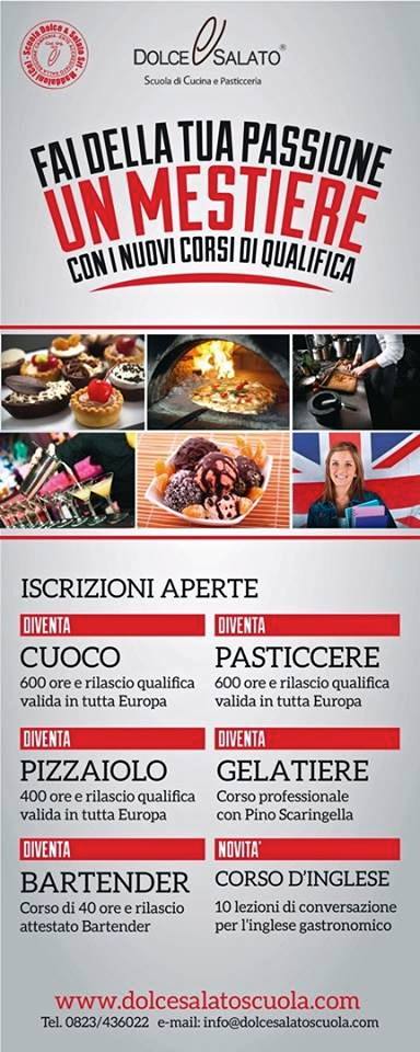 La Scuola di Formazione Professionale Dolce&Salato, ente accreditato alla Regione Campania e patrocinato dall’Università Federico II di Napoli con sede a Maddaloni in provincia di Caserta, prima realtà della Campania e del Mezzogiorno ad occuparsi di alta formazione in ambito gastronomico fondata e diretta dai maestri chef Giuseppe Daddio e Aniello di Caprio, per la prossima stagione, la Primavera, offre un pacchetto didattico formativo davvero interessante, per tutti i giovani che vogliono intraprendere la professione di chef, pasticceri, pizzaioli e barman. I corsi partiranno l’11 aprile e termineranno il 9 luglio 2016.