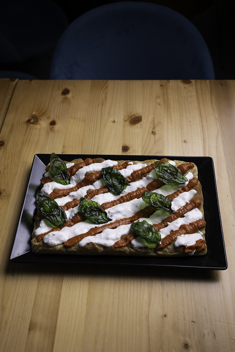 Realizzare sulla base della pizza, con l’aiuto di una sac à poche, delle linee alternate di salsa di pomodorini rossi semi-dry e stracciatella. Completare con il basilico cristallizzato e olio extravergine di oliva.