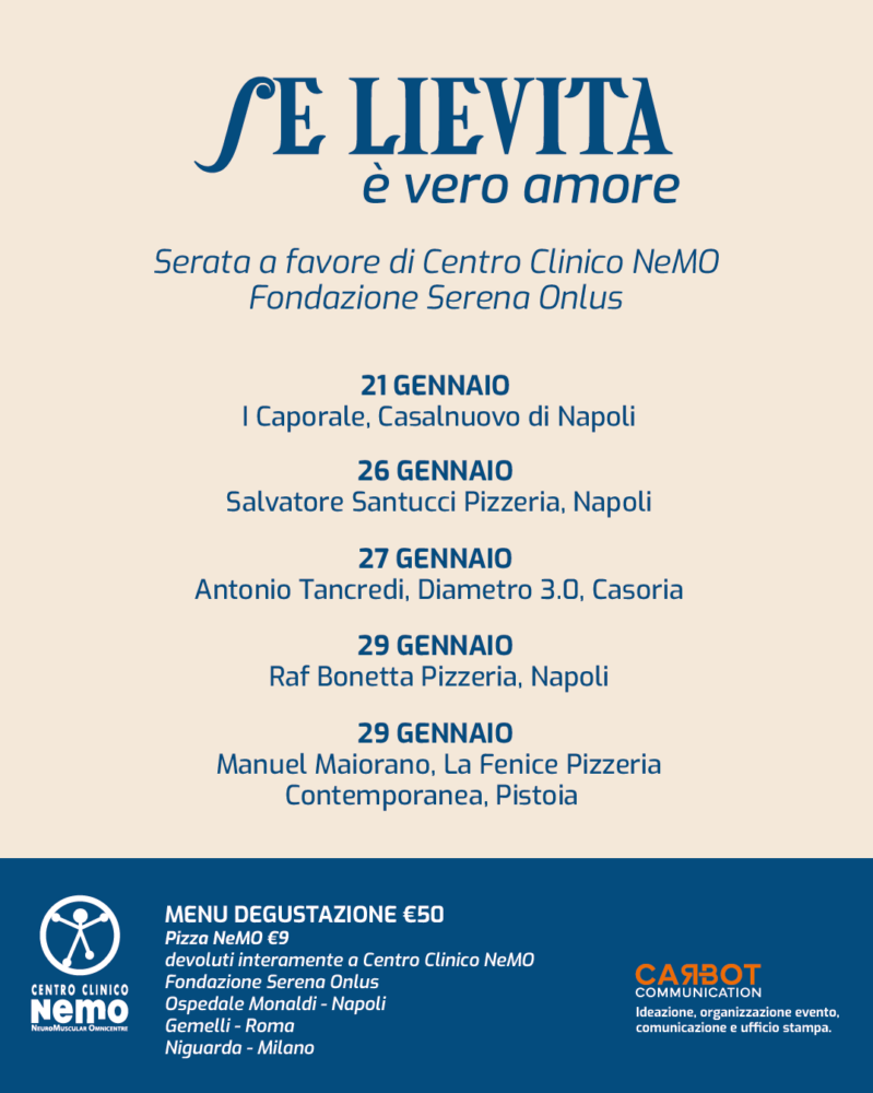 La pizza, simbolo di condivisione e convivialità, diventa uno strumento benefico concreto con “Se lievita è vero Amore”, il nuovo progetto ideato, progettato e realizzato da Carbot Communication, che coinvolge 10 pizzerie italiane d’eccellenza in un percorso solidale. La prima tappa si è svolta da I Caporale a Casalnuovo di Napoli con un obiettivo chiaro: devolvere l’intero incasso delle serate e delle vendite solidali a sostegno della ricerca e dell’assistenza sanitaria operata da Fondazione Serena Onlus per il Centro Clinico NeMO presso l’Azienda Ospedaliera Specialistica dei Colli – Ospedale Monaldi di Napoli, il Policlinico Gemelli di Roma e l’Ospedale Niguarda di Milano.