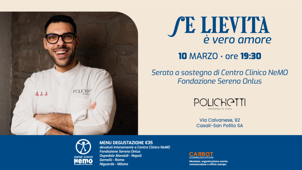 La pizza, simbolo di condivisione e convivialità, diventa uno strumento benefico concreto con “Se lievita è vero Amore”, il nuovo progetto ideato, progettato e realizzato da Carbot Communication, che coinvolge 10 pizzerie italiane d’eccellenza in un percorso solidale. La prima tappa si è svolta da I Caporale a Casalnuovo di Napoli con un obiettivo chiaro: devolvere l’intero incasso delle serate e delle vendite solidali a sostegno della ricerca e dell’assistenza sanitaria operata da Fondazione Serena Onlus per il Centro Clinico NeMO presso l’Azienda Ospedaliera Specialistica dei Colli – Ospedale Monaldi di Napoli, il Policlinico Gemelli di Roma e l’Ospedale Niguarda di Milano.