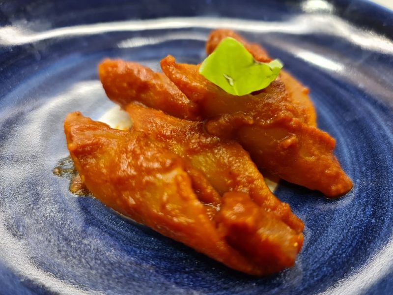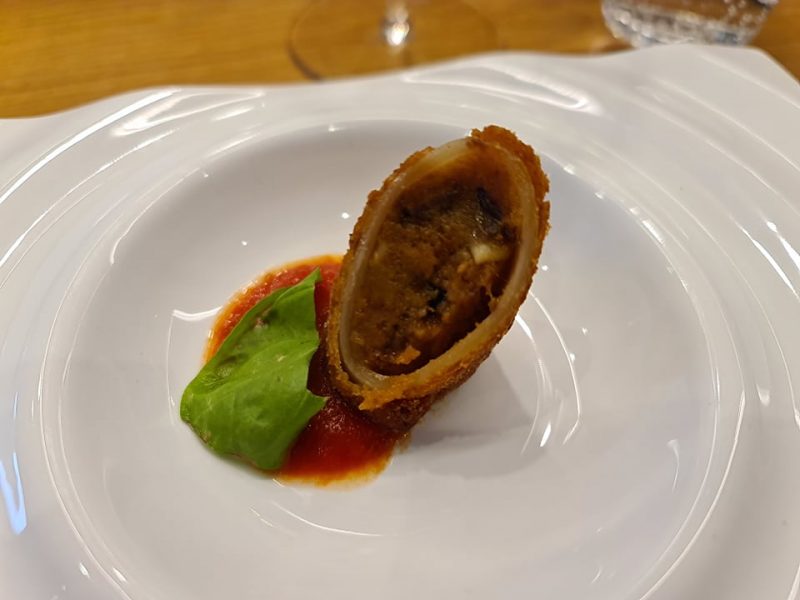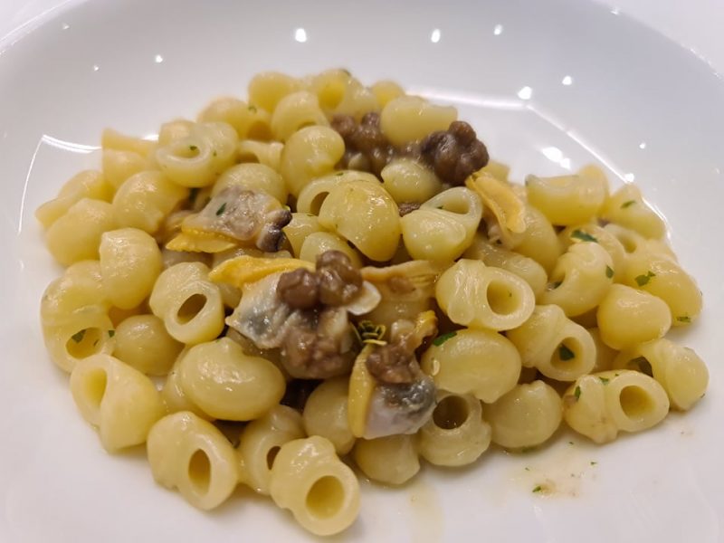 Durante l’ultimo pranzo abbiamo potuto apprezzare due piatti che ci hanno colpito, per il pensiero e la modernità. Segnano l’evoluzione di questo posto e probabilmente anche l’evoluzione dei nostri modi di consumare la pasta. Attingendo sempre dalla tradizione campana nascono gli stivalettini con il brodo di polpo. Gli stivalettini sono un formato di pasta corta, bucato al centro. Un formato arcaico, adatto per le minestre e la pasta con i legumi. Rende al meglio con le cotture minestrate (molti usano impropriamente il termine risottare). Il brodo di polpo (‘o bror ‘e purp) è uno dei piatti di strada più antichi della storia partenopea, antesignano del moderno street food. Era la controproposta della mensa dei poveri, alla tavola dei ricchi sulla quale si serviva il brodo di carne. Una versione mediterranea del Ramen, la zuppa giapponese che però ha origini cinesi. Il gusto intenso, la speziatura decisa, un brodo pulito e concentrato nel gusto, la pasta che media la sensazione, stimolando il quinto gusto in maniera decisa.