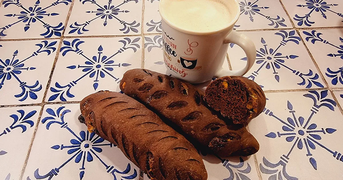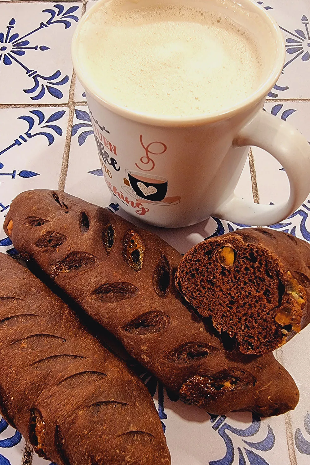 Aggiungere circa 500 g di acqua al poolish, mescolare, trasferire il composto nella vasca dell’impastatrice ed aggiungere altri 500 g di acqua, il lievito e le farine. Impastare per 5 minuti in prima velocità e poi altri 2 minuti in seconda velocità. Aggiungere il sale in prima velocità e lavorare ancora l’impasto per un minuto in seconda velocità. Incorporare cacao e acqua e successivamente le pepite di cioccolato bianco e la frutta secca. Chiudere l’impasto a 23/24 °C. Trasferire su un banco da lavoro, dare qualche piega e lasciar riposare per un’ora. Stagliare l’impasto in pezzi da 100 g l’uno e lasciarli riposare per 20 minuti. Trascorso il tempo di riposo, formare dei filoncini dalla misura di circa 10 cm e disporli su placche da forno. Effettuare dei tagli e lasciar riposare per circa un’ora e mezza a 25 °C. Posizionare sotto ogni filoncino un rametto di rosmarino ed infornare a 210 °C per 13 minuti con vapore all’80%. Estrarre i filoncini dal forno, lasciar raffreddare e rimuovere i rametti di rosmarino.