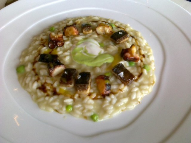 Il risotto si sente sotto i denti, pochissime frazioni di attimo e a scrocchiare sarà in realtà l’anguilla. Buonissimo. Può il mare essere croccante? Però. Molto buono il tono fumé che fa da cornice al piatto.