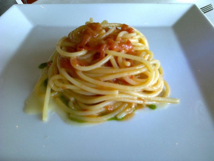 Dalla carta scegliamo due primi: un classico (del 1994) e una novità. Uno spaghettoro Verrigni agli scampi con pomodoro fresco, zenzero e salsa di cavolo cappuccio. La cottura perfetta fa onore al formato speciale, i sapori tutti netti, lo zenzero è la chiave del successo papillare.