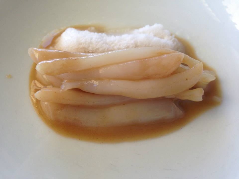 Uliassi, tagliatelle di seppia con alghe e quinoa fritta (2005) e seppie sporche, con granita di ricci di mare