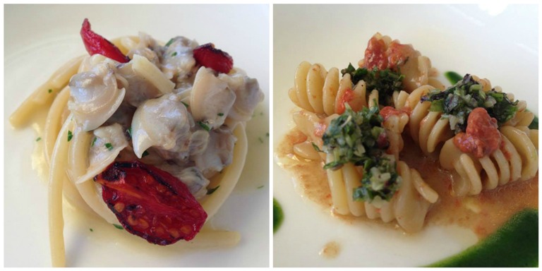 Uliassi, spaghetti alle vongole affumicati e fusillone con acetosa, acetosella, cicoria e riccio di mare