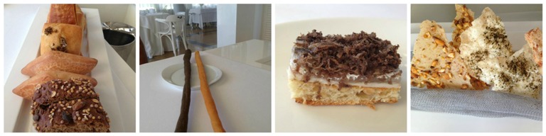Uliassi, da sinistra: il pane, grissini di grano arso e parmigiano, crostino di benvenuto con alici e bagnacauda, crackers in attesa del pranzo
