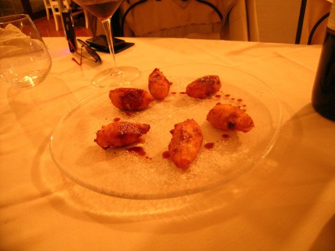 Le bottiglie aperte per la degustazione, invece, Paolo Dettori ce le fa gentilmente trovare in tavola. Si, perché Dettori, dall’incontro con un cuoco e gourmet di esperienza come Piero Cadeddu, è da un anno anche accoglienza, con l’agriturismo “Kent’Annos”. Piero ha abbandonato la ricerca ed ha abbracciato –ci racconta dopo la lunga serata di lavoro- la scelta di vita dei Dettori: semplicità, tradizione e attenzione maniacale alle materie prime, quelle a portata di mare, prodotte in Romangia. Dal forno a legna e dalle brace arriva la storia della gastronomia sarda, riproposta con garbo e sapienza, giusto contrappunto ai vini che si aprono a nuove sensazioni man mano che la serata va avanti. Ad aprire, insalatina di verdure con frutta secca, polpette di carne, frittura di verdure, pasticcio di carote, cipolla arrosto. Quindi pasta di pane carasau con pomodoro e formaggio e fettuccine al cannonau con ragù di pecora, ottime. A seguire, maialino con patate e carne alle erbe aromatiche. Chiusura semplice, con una delicata ricotta fritta.