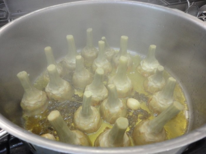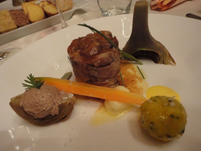 con osso!!! Completano il piatto il carciofo intagliato “alla Marchesi”, il ripieno di pane pancetta uova prezzemolo aglio e pecorino (ma non chiamateli canederli, per favore), ed il gelato ottenuto con il soffritto di coratella dell’agnello stesso.