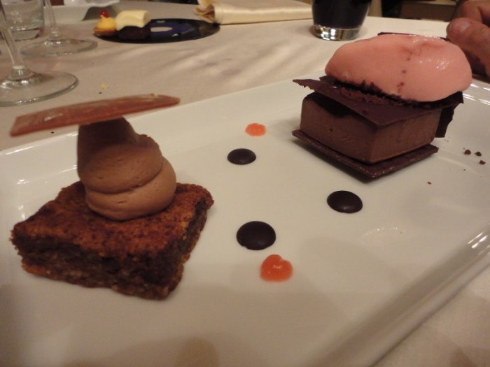 Sulla destra invece, un tortino di mandorle e cacao sempre con la namelaka di cioccolato al latte e gocce di gel di rabarbaro. In questo dolce c’è anche lo zampino di Marco Caputo, il secondo di Mirko Balzano a Villa Assunta.