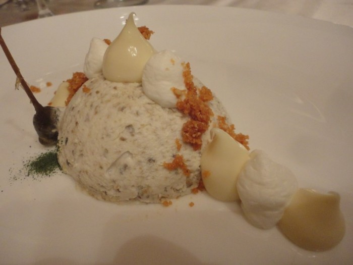 Quindi un semifreddo ai capperi con una namelaka al cioccolato bianco, un biscotto sbriciolato alle nocciole ed il cucunci caramellato.