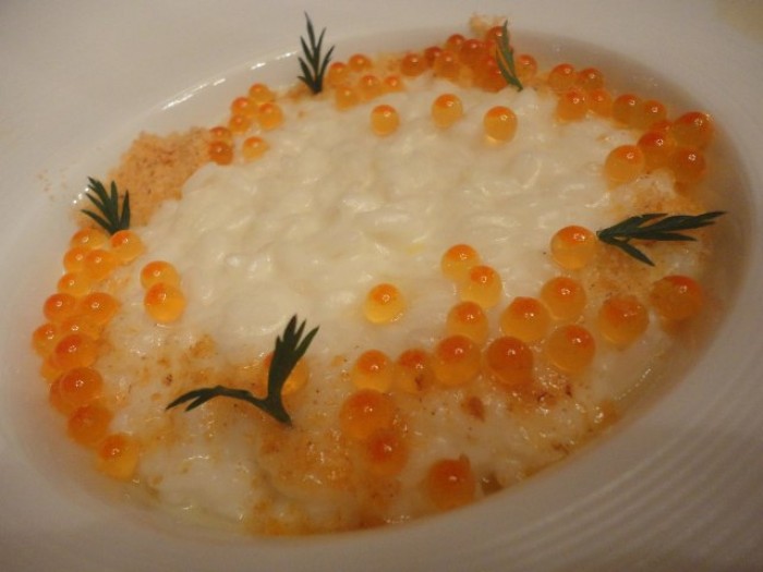 E siamo al piatto concettuale: il nostro chef propone “la matematica del gusto”, cioè bilanciamenti e contrasti netti nei quali la matematica cerca di unire dei sapori che si scontrano tra loro. L’idea è quella di bilanciare la dolcezza amidosa del riso(acquerello) con una nota acida. Poi la nota salata delle uova, nelle due versioni, secche e fresche. E infine la nota dolce del miele artigianale di una signora di Gesualdo, che cerca di coniugare l’acido con il salato. Beh, questo è un piatto border-line, almeno per i miei gusti!!! A parte la cottura del riso un filino prematura, per noi meridionali che siamo abituati a mangiarlo scotto(cit. il Pigna, manco lui fosse originario della Valle d’Aosta), ho trovato troppo netta la separazione dei diversi elementi. Ad esempio, le uova di trota, svolgono la loro funzione solo al momento della rottura delle stesse sotto ai denti e che non sempre è contestuale alla percezione degli altri sapori. Lo definirei “un piatto shock”, almeno a guardare la faccia di Luigi Tecce nel mentre lo trangugiava.