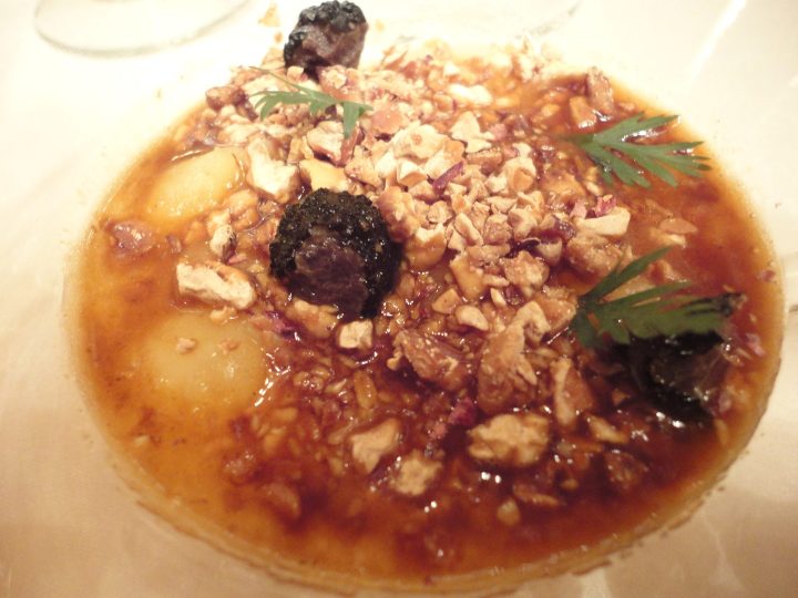 Fantastica, sia nella percezione aromatica delle erbe che nella pienezza del brodo, forse appena un pò al di sotto della temperatura ottimale, avrà pesato il lungo tragitto per raggiungerci, questa volta eravamo collocati molto distanti dalle cucine. Zuppa di castagne, patate, porcini secchi e tartufo nero cotto.