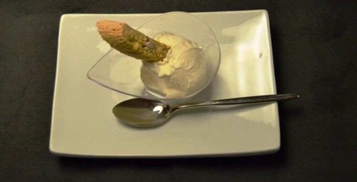 La cena finisce con due dessert: una squisita sbriciolata e, soprattutto, il superbo ed insuperabile gelato al Moscato del maestro Enzo Crivella, che ha ricevuto, ovviamente, la convinta e giusta approvazione da parte di tutti i commensali. In abbinamento abbiamo degustato il Moscato Ambra, da uve surmature. Vino classico territoriale, primariamente aromatico. Nuances di canditi, frutta secca, miele, pasta di mandorle e frutta esotica. Gusto penetrante e pervasivo che arrotonda il palato e lo mantiene bello elastico.
