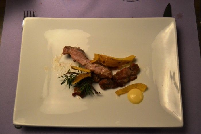 Per il primo dei secondi piatti ecco arrivare il must della serata: tagliata di maialino nero lucano e bucce di patate in compagnia dell’Aglianico Eleano 2007, il top aziendale. La carne è tenera, gustosa e cotta a puntino. Il vino è superlativo e si sposa alla perfezione col cibo.
