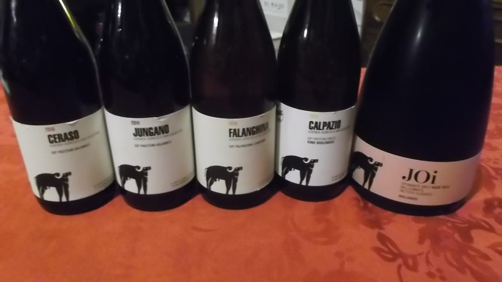 E per finire ecco lo Jungano Aglianico Paestum Igp 2014, che è stato affinato un anno in legno piccolo e grande. Qui il colore vira già verso un rubino più concentrato, con riflessi purpurei ai bordi. Sentori deliziosi ed ammalianti di frutta rossa e nera, fiuto speziato ed aromi sapidi e vegetali. In bocca timbro secco e tensitivo. Tannini raffinati e leggermente graffianti. Avvincente la naturalezza espressiva che sa esprimere il fraseggio gustativo. Polposo il frutto già maturo, che incrocia un coté balsamico. Palato denso e goloso. Finale incessante.