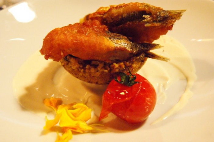 L’avevamo promesso e ci siamo ritornati. Da Gran Gusto ancora una volta è uno chef stellato ad accompagnare in una cena a quattro mani il padrone di casa Alessandro Romano. Stiamo parlando di Paolo Barrale, chef del Marennà di Sorbo Serpico (Av). Di lui conosciamo tutto, dall’esperienza con Heinz Beck, alla stella Michelin, fino alla vicepresidenza della Chic (Charming Italian Chef). Nonostante la pioggia torrenziale che ci ha fatto compagnia in questi giorni, i due chef non hanno deluso i partecipanti all’evento a quattro mani, proponendo una cena dai sapori semplici ma ben definiti. Dopo gli appetizers di benvenuto, si apre con l’antipasto dello chef di casa: tartellette di pane cafone, aliciotti in tempura di pomodorini del piennolo, fonduta di provola di Agerola brulè, un piatto ben bilanciato che dimostra il percorso di maturazione di Alessandro.