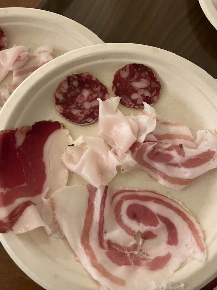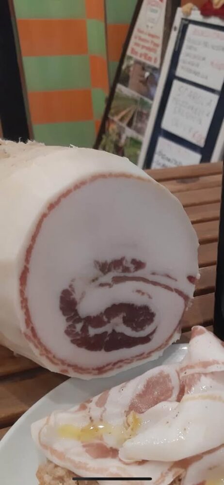 E’ toccato poi ai salumi di Dino di mantenere alto il livello della degustazione, obiettivo raggiunto a mani basse, grazie ad una pancetta e un lardo dalla indicibile scioglievolezza, segno di una alimentazione ricca di acidi insaturi e di un benessere animale portato ai massimi livelli. Infatti gli animali vivono semibradi nella campagna dell’alto annio, nutrendosi di sottobosco e radici, e di ghiande nel periodo che va da settembre a novembre.