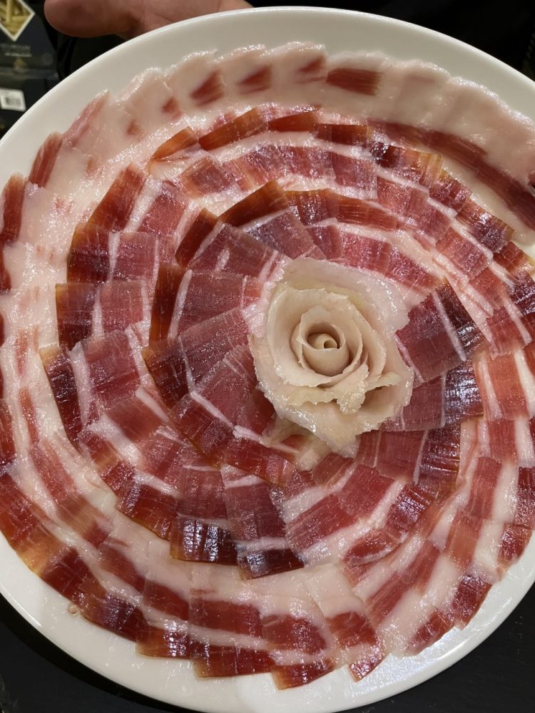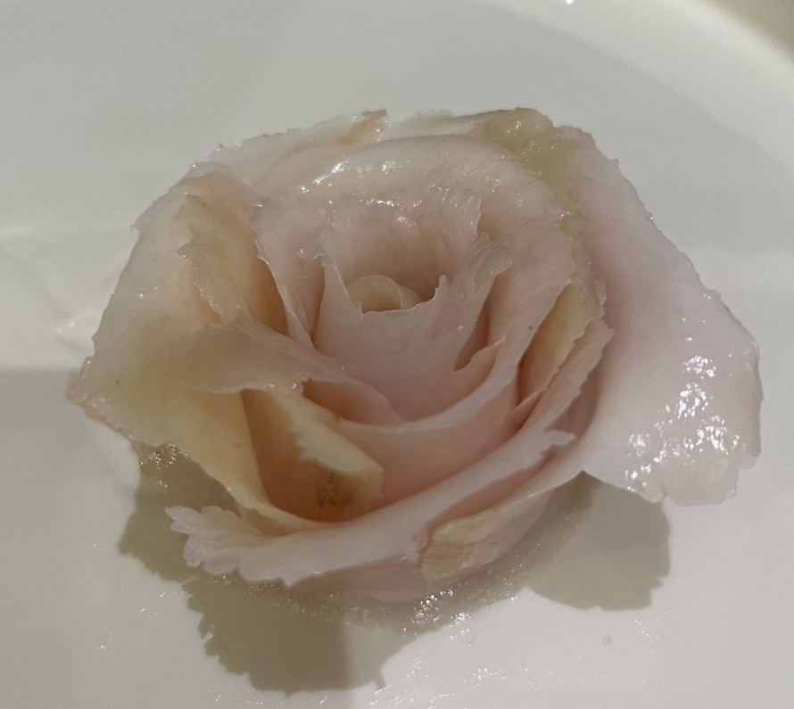 Arte chiama arte e al taglio è venuto un artista del settore, Carmine de Cristofaro, la sua rosa di lardo, sembra uscita da un quadro di Irene Klestova.