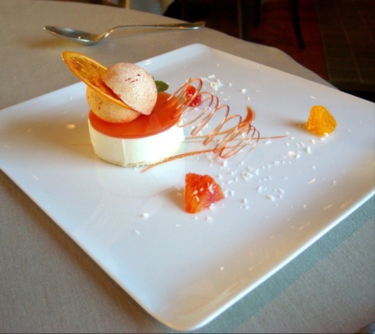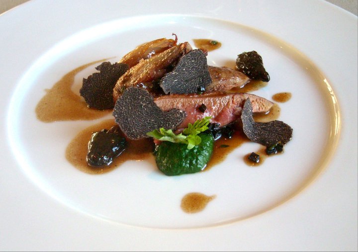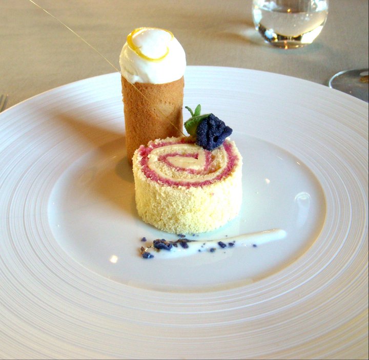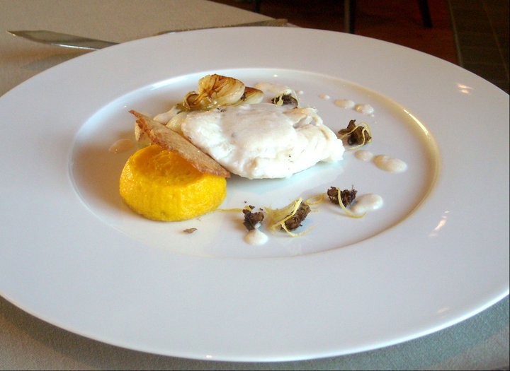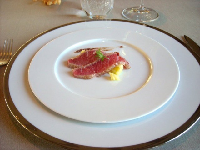 I come inatteso: bagliori, lampi, attimi da ricordare disseminati nei piatti. L’argento plumbeo del caviale Asetra, bellissimo ed elegante tra avorio e rosso di gnocchi e gamberi liguri, il rosa e l’oro di piccole, dolci, costolette di capretto impanate e fritte, l’amaranto inopinato del piccione cotto in casseruola con le sue ossa, il nocciola della crosta di sale e caffè da cui emerge un integro trancio di rombo, bianco, il nero del tartufo, il viola e il giallo di una nostalgica girella alla vaniglia, l’arancio intenso degli agrumi di Sicilia.
