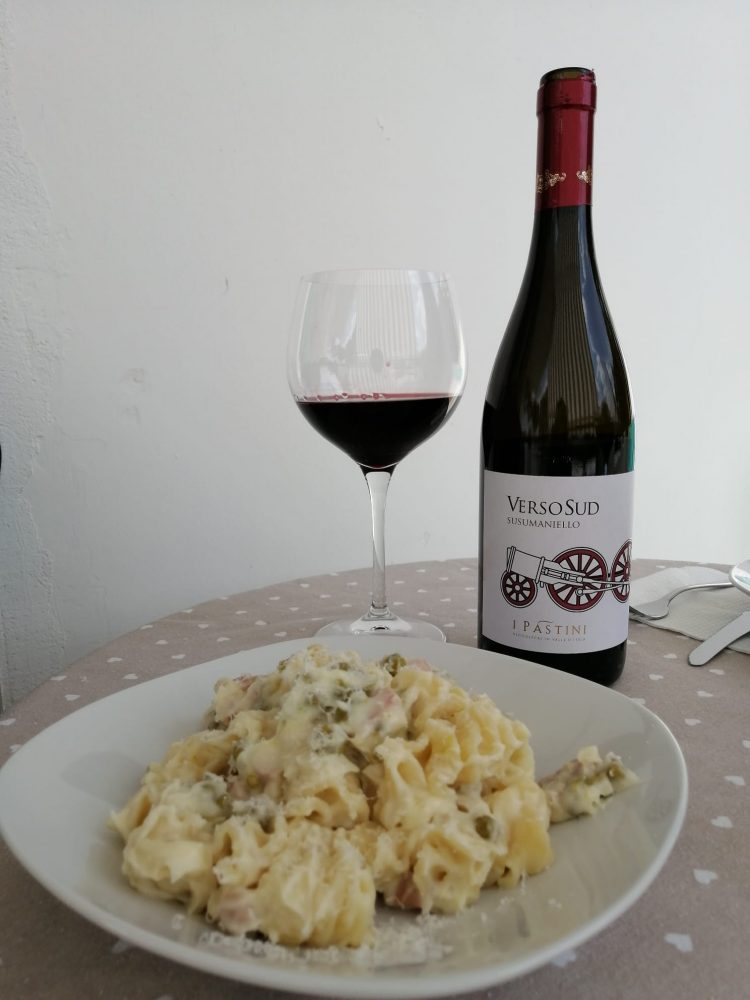 Ad accompagnare il piatto un ottimo Susumaniello. Vitigno autoctono pugliese, 14 gradi, casa vinicola I Pastini. Una piccola azienda della famiglia Carparelli, a Martina Franca, Taranto. Fondata nel 1996 è tra le prime a puntare sul rinnovamento e sul rilancio della vitivinicoltura in valle d’Itria. Di rilievo Versosud, un rosso generoso ottenuto da uve Susumaniello in purezza. Un Igp del 2017, limpido, rosso rubino con un variopinto corredo olfattivo, che effonde sentori di amarena, peonia, pepe nero. Sorso di struttura, equilibrato e dinamico, corroborato da tannini vellutati. Sosta in acciaio per 5 mesi e in barrique per altri 6.