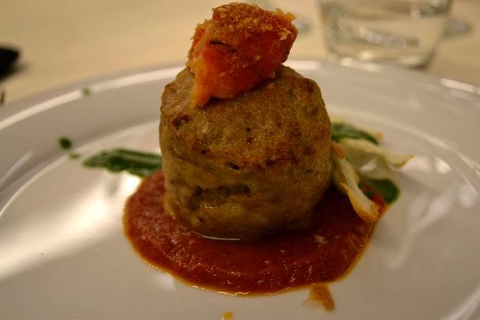 Polpetta di manzo dal cilindro con pinoli, uvetta e “ragu’ antico napoletano”, involtino di peperoni, gocce di prezzemolo e pane di San Sebastiano al Vesuvio (Estatico)