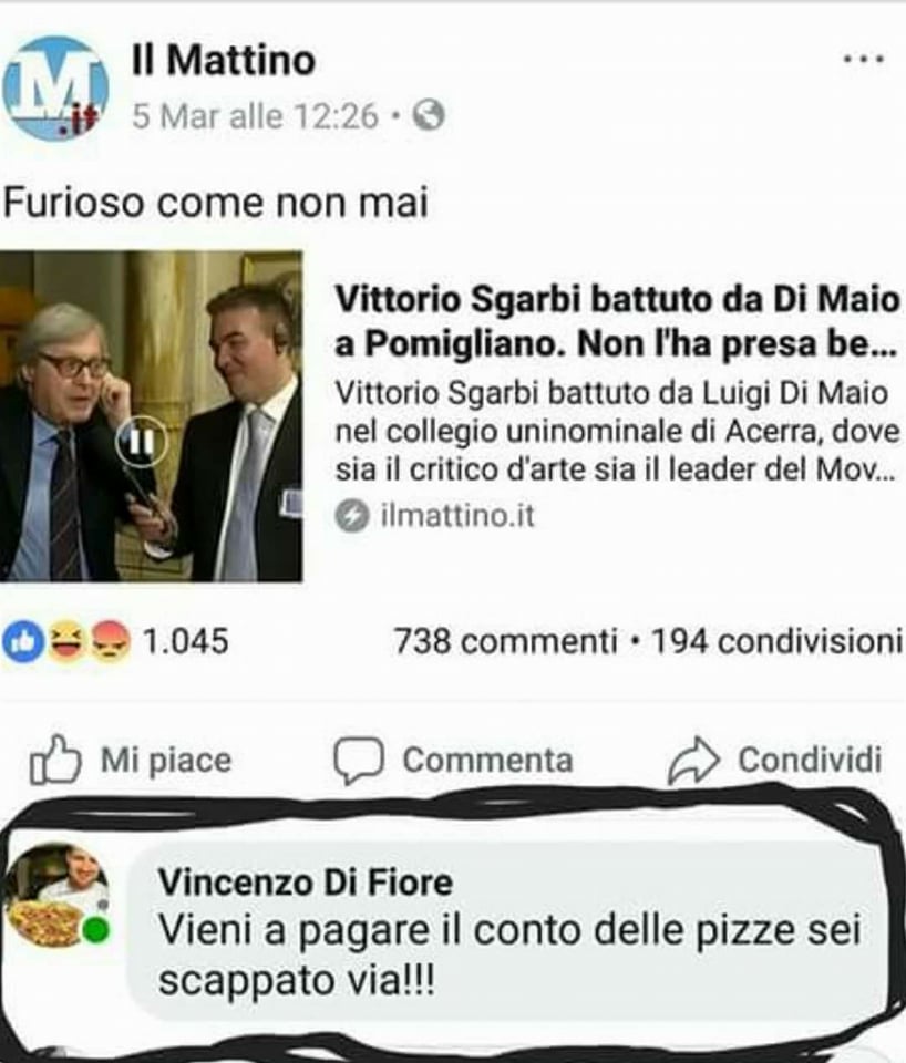 Fino a qui la cosa poteva anche non interessarci, quando, oibò, tra i commenti ad un pezzo del Mattino spunta quello del pizzaiolo Vincenzo Di Fiore, titolare della pizzeria Bellanapoli che dice che Sgarbi ha mangiato la pizza da lui andandosene senza pagare.