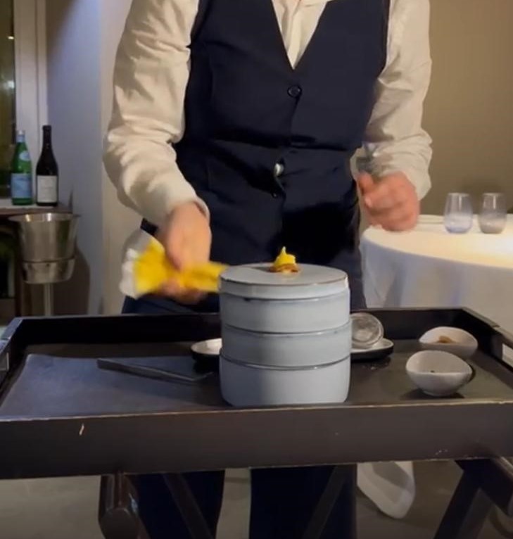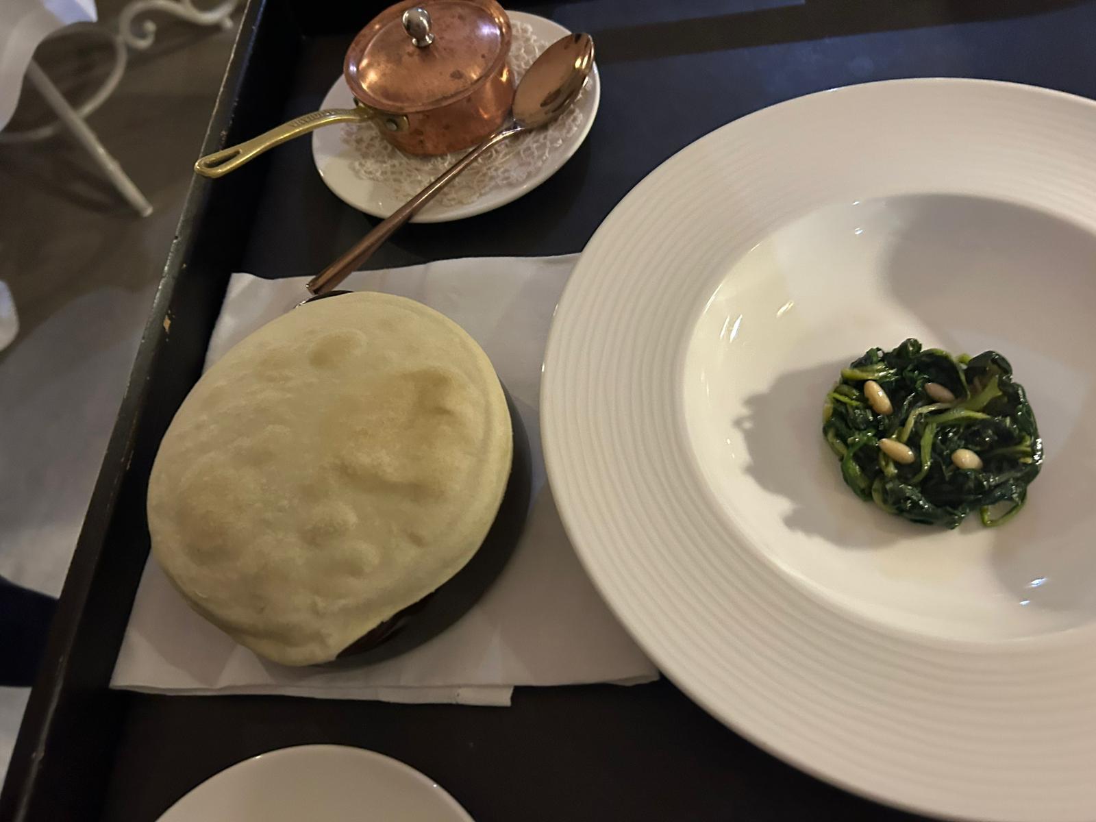 A seguire rombo al burro con foglie di limone cotto in cocotte chiusa da un disco di pasta di pane, cicoria selvatica e ristretto di vongole. Il piatto s’ispira alla sogliola alla mugnaia, il limone è stato sostituito dalle sue foglie, la farina dalla pasta di pane, il ristretto di vongole regala un’interpretazione ancora più marina, mentre la cicoria selvatica è il consueto omaggio alla campagna etnea.