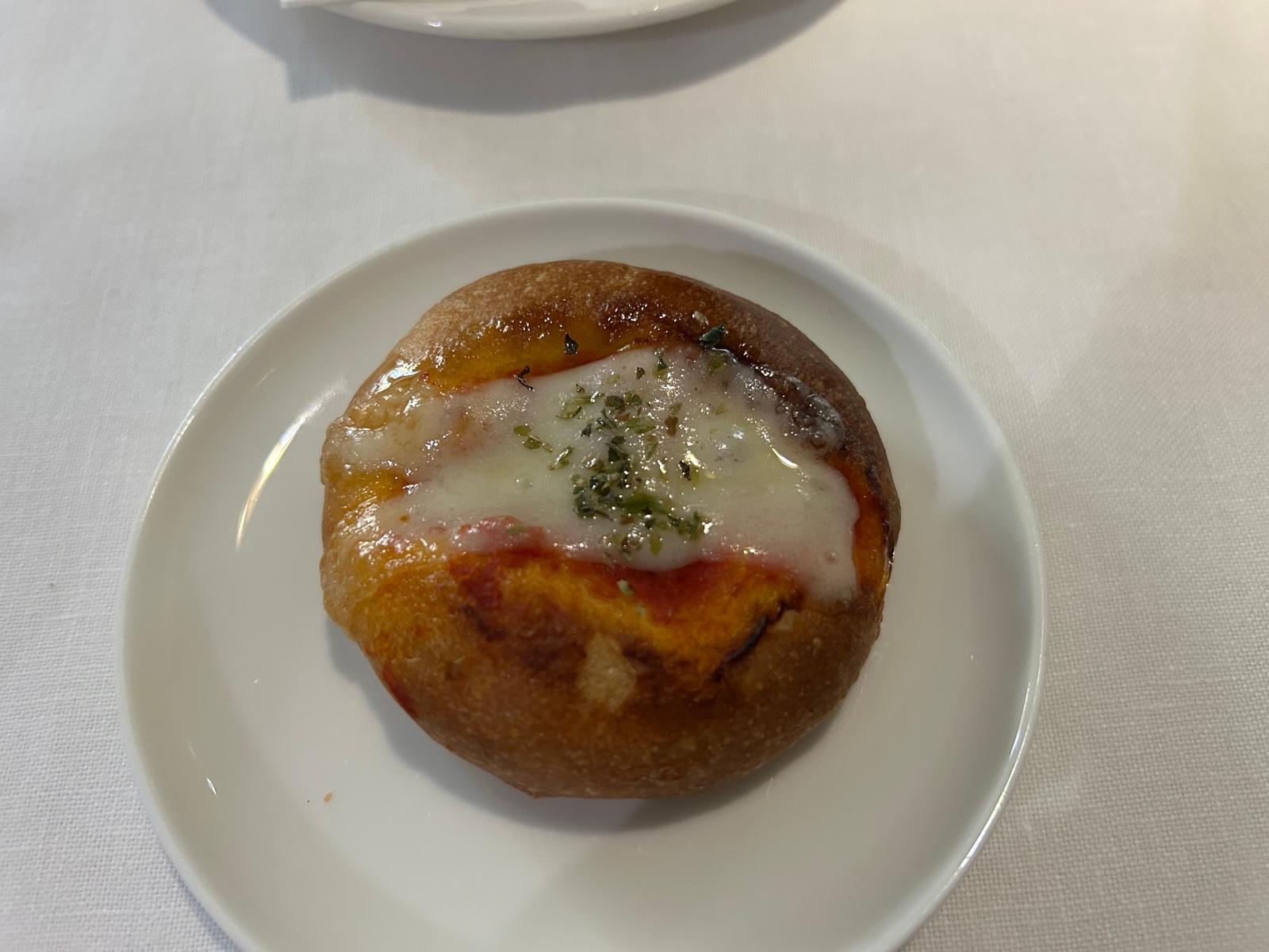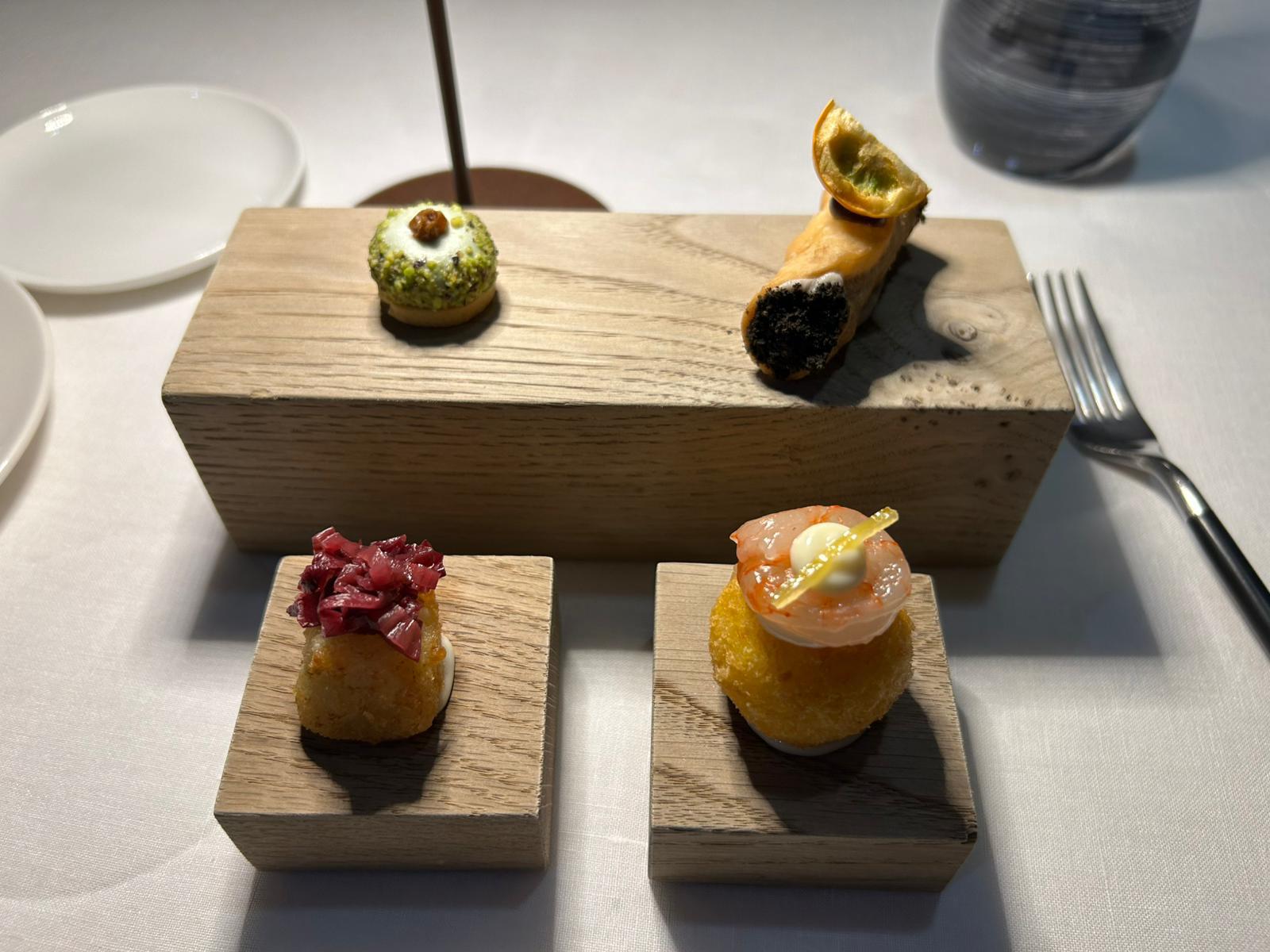 Abbiamo iniziato con il piatto signature dello chef: vitellina a punta di coltello, fonduta di formaggi siciliani e bacche di ginepro essiccate, affumicata agli aghi di pino. Un piatto che anche nei colori racconta l’Etna: il bianco delle stagioni delle nevi, il rosso delle eruzioni, i sentieri grazie alle bacche di ginepro essiccate e il pennacchio di fumo che dà il buongiorno a chiunque ne guardi la cima, rappresentato dagli aghi di pino bruciati.