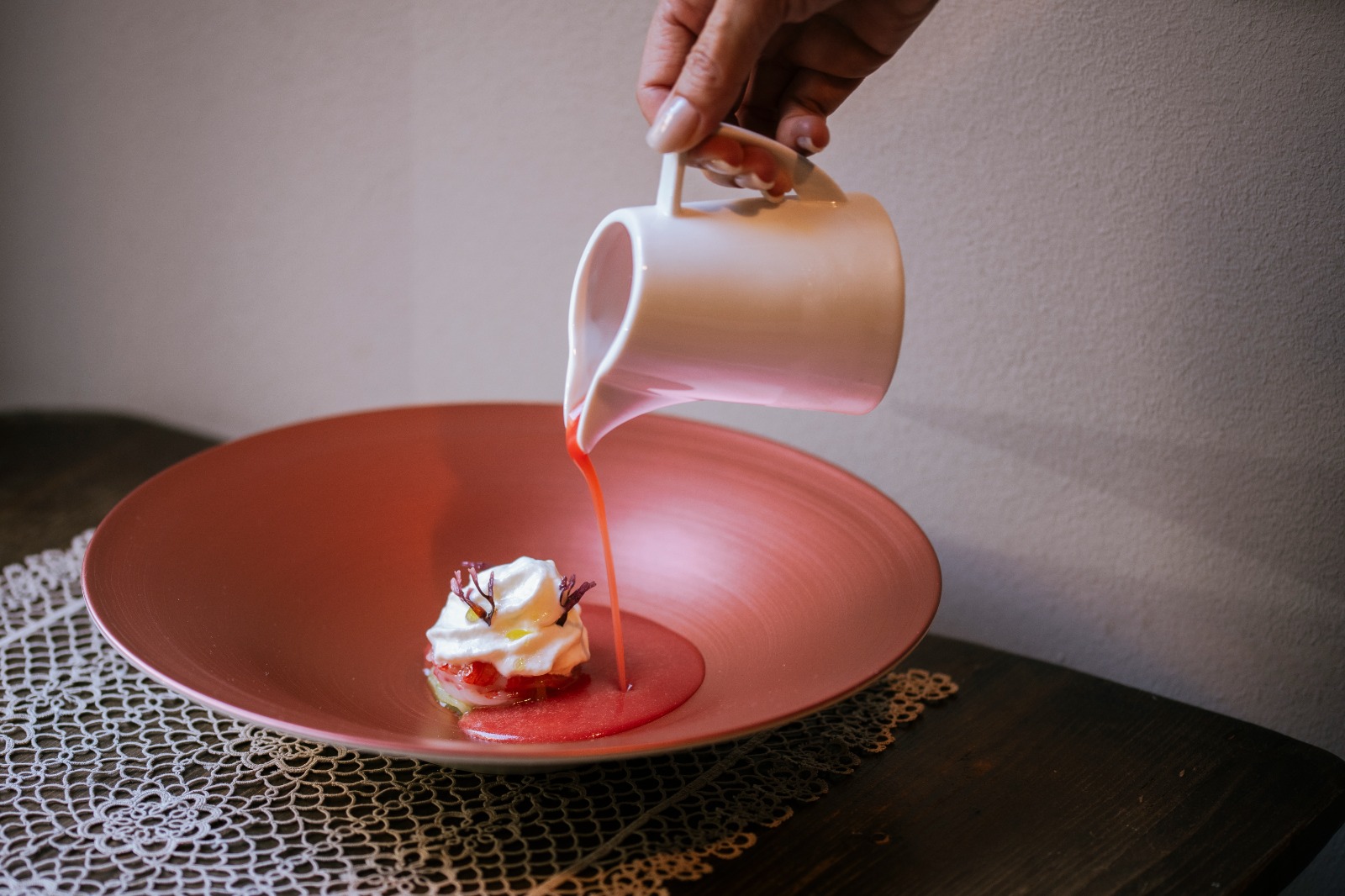 Sempre mare e monti nel crudo di gambero rosso, impreziosito da cetriolo all’acqua di mare, succo di pomodoro datterino e spuma di burrata.