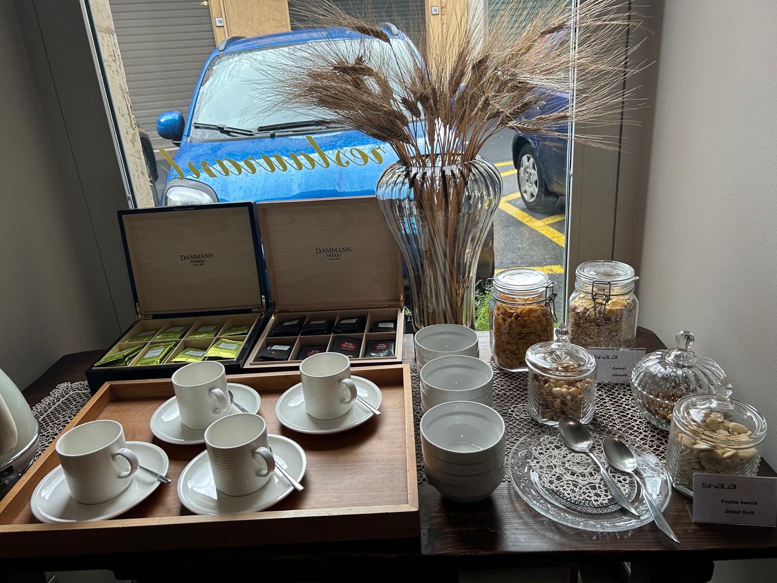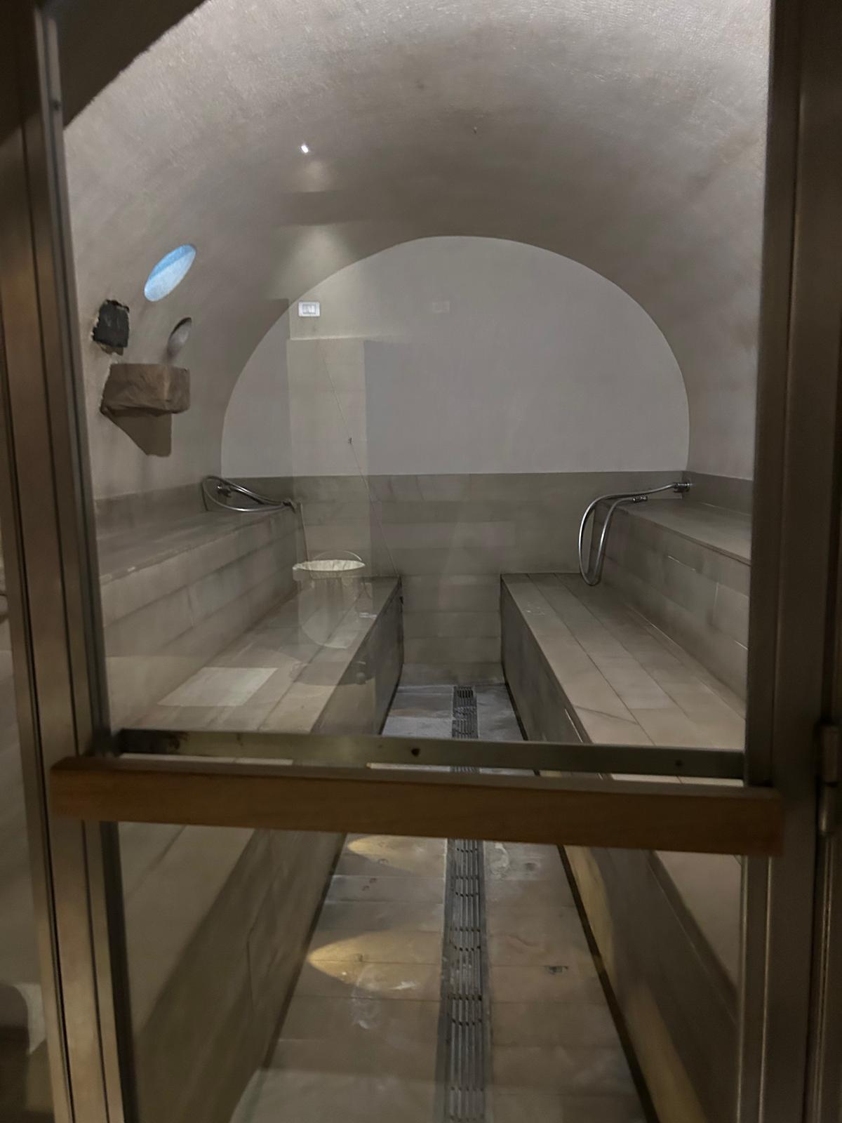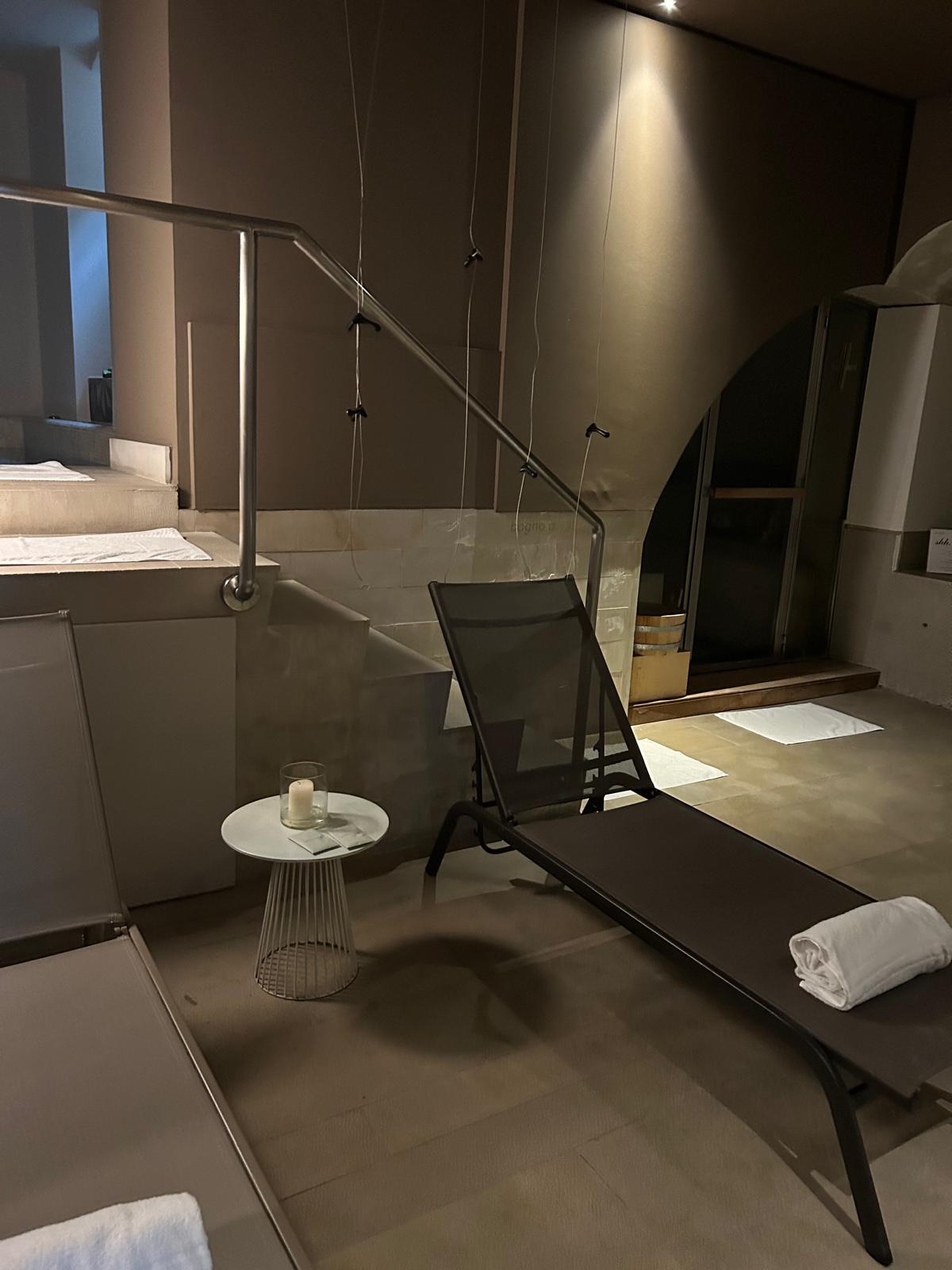 Accanto si trova una piccola ma ben attrezzata area benessere, completa di sala massaggi, sauna, vasca idromassaggio e un angolo dedicato agli infusi, pensato per offrire un’esperienza di relax totale.