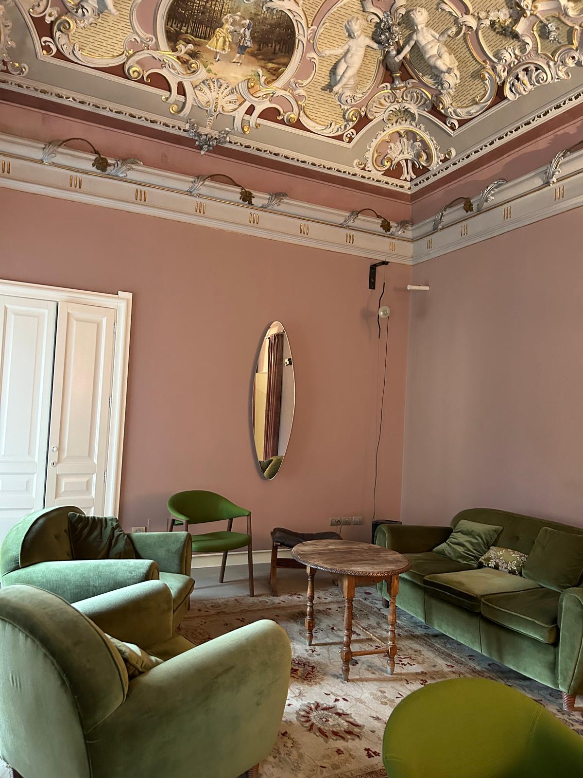Magnifico l’atrio arredato con tavoli in ferro e piante che riportano ad un tempo che fu che si intravede dalla hall e dalle camere che affacciano su di esso. Angoli di suggestiva bellezza che, verosimilmente, due secoli fa furono scenario di incontri romantici, ma anche teatro di decisioni legate agli assetti di potere politico del paese.