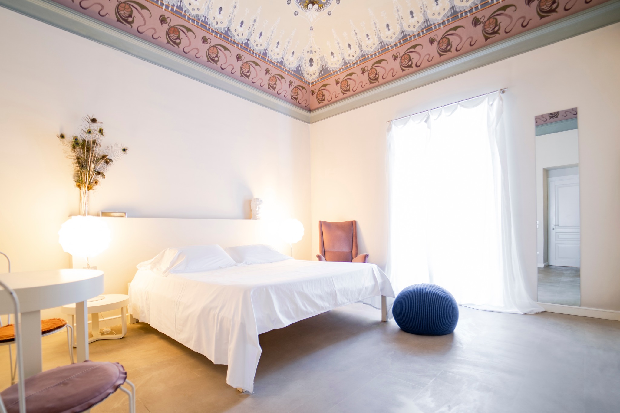 Le tredici stanze situate al piano superiore, insieme a un salotto un tempo di rappresentanza e oggi dedicato al relax intimo degli ospiti tra libri d’arte che raccontano la Sicilia più autentica, conservano tutto il fascino dell’antica dimora grazie agli affreschi e agli arredi recuperati con cura certosina. Il bianco è il colore predominante, sia nelle pareti che nella raffinata biancheria delle camere.