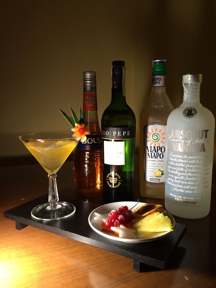 Base Absolute vanilia per conferire struttura e rotondità. Si va a rinforzare la parte agrumata seminascosta del cocktail con liquore Mapo Mapo, rinforzata ma leggermente zuccherata da un goccio di Bitter Orange Bols. Sherry fino seco.
