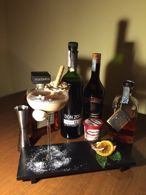 Si va a dare subito una base decisa e netta con una grappa Bottega barrique riserva, nella quale vado a scogliere due bei cucchiaini di gelato alla noce di Macadamia Haagen-Dazs, correggo a piccole dosi con Baileys caramel flavour e Disaronno.