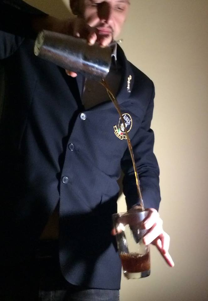 Affumicatura del ghiaccio con sigarello toscano al caffè. Base alcolica scelta sul territorio, grandissimo brandy spagnolo Fundador solera exclusivo reserva.