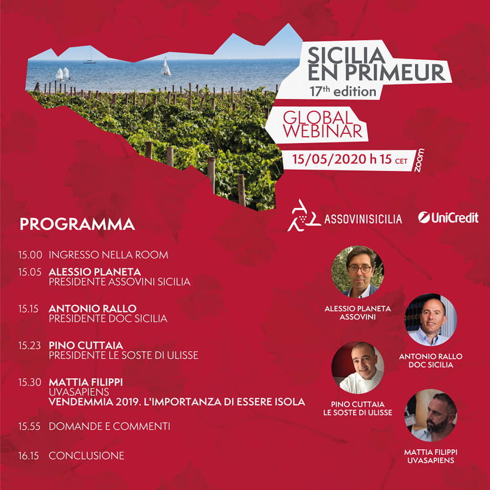 Lo ha fatto in maniera virtuale, com’è prassi oggi, riunendo in un collegamento multimediale oltre 200 persone da tutto il mondo, tra giornalisti e produttori siciliani. All’evento erano presenti Alessio Planeta, Presidente di Assovini Sicilia, Antonio Rallo, Presidente del Consorzio DOC Sicilia, Mattia Filippi, enologo e consulente fondatore di Uva Sapiens e, gradito ospite, lo chef bistellato Pino Cuttaia, Presidente de Le Soste di Ulisse e patron de La Madia.