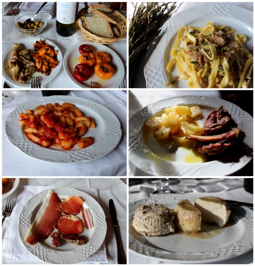 Masseria Starnali: antipasti, fettuccine porcini e asparagi, i cavatelli di casa al ragù di maiale, l’agnello con le patate locali, il caso peruto classico e sott’olio e il maiale nel piatto