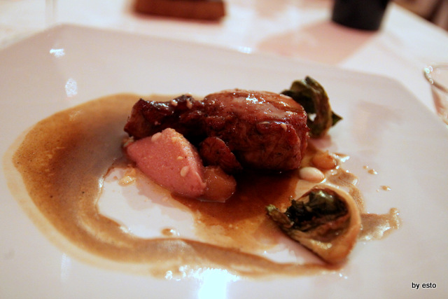 Poi il primo, gli Gnudi di ricotta di bufala, passato di torzella, animelle e limone. Uno gnocco delicatissimo che si accompagna all’amaro della torzella e alla dolcezza dell’animella inacidita dal suo sfumare in padella con il limone.
