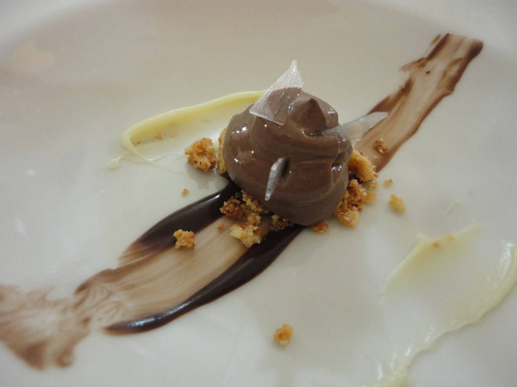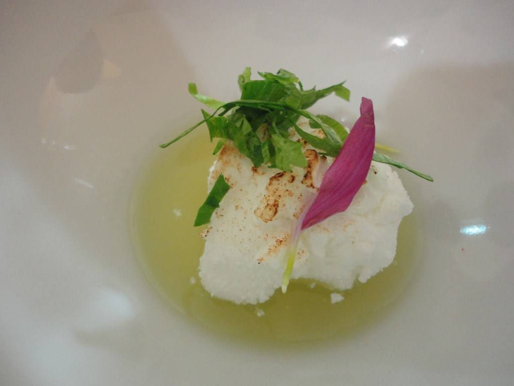 ” L‘idea – ci dice lo chef – “è quella di riprodurre il gusto del carciofo arrostito che tanto mi piaceva quando andavo da piccolo per le strade di paesi della provincia di Napoli e sentivo quei profumi”. Per questo piatto Giovanni ha usato una tecnica molto complessa di scomposizione del prodotto e di diverse cotture. Il risultato è superbo. Cottura perfetta della pasta, delicatezza avvolgente della salsa di condimento e sapori ancestrali. In abbinamento Falerno del Massico 2011 di Villa Matilde.