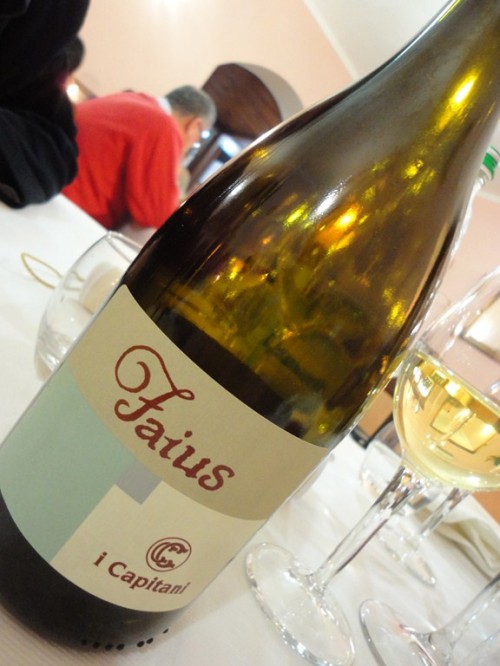 Era la prima volta che sentivo questo piatto, ma mi ha lasciato interdetto per la completezza e l’esplosione dei sapori. Dolcezza aromaticità e sapidità si fondono insieme in un abbraccio molto caldo, direi ustionante…ah, a proposito Mirko, sarebbe opportuno avvertire i commensali di fare attenzione nel portare alla bocca il cucchiaino colmo di pane e cipolla…;-)) In abbinamento il Faius 2010 della cantina ” I Capitani” di Torre le Nocelle(Av).
